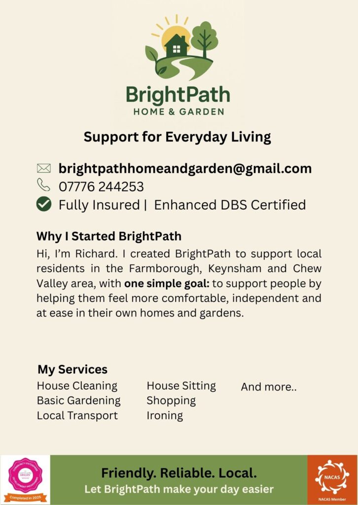 BrightPath is built on that understanding. I provide friendly, reliable, and practical help for residents in Farmborough, Keynsham, and the Chew Valley area. Whether it’s household tasks, light garden work, or simply being a trustworthy presence, my focus is on making everyday life easier and more enjoyable.