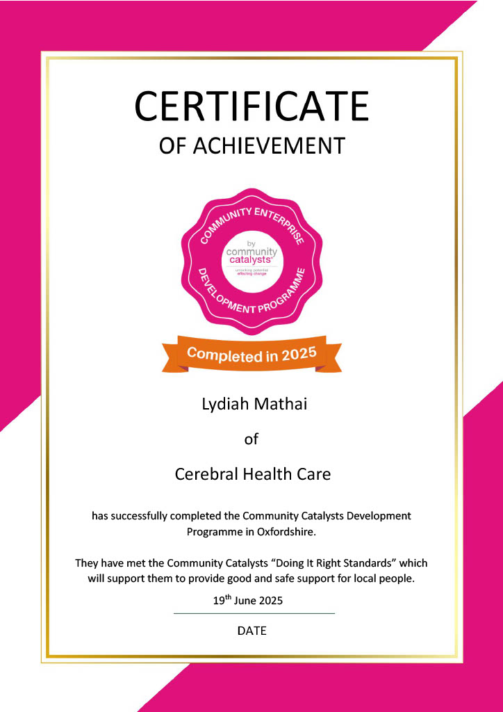 My Name is Lydiah Mathai, I am a trained, passionate and dedicated carer with diverse experience. My drive to start Cerebral Healthcare was inspire by the gap in the industry. So many agencies offering services that are very regimental and do not offer personalised care where the clients miss on a lot.