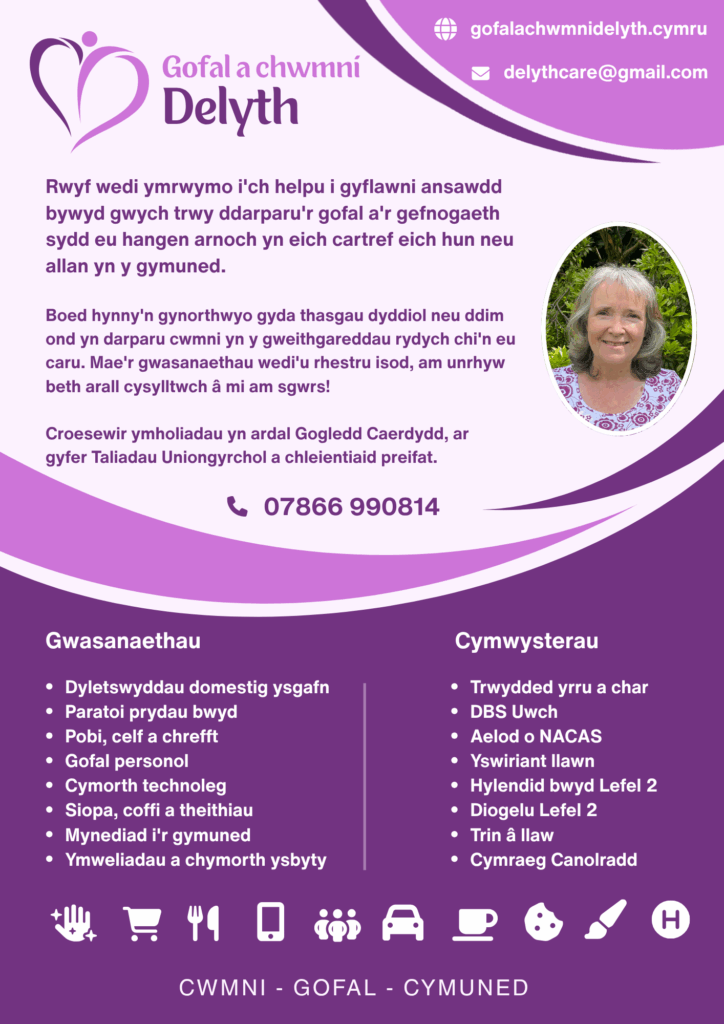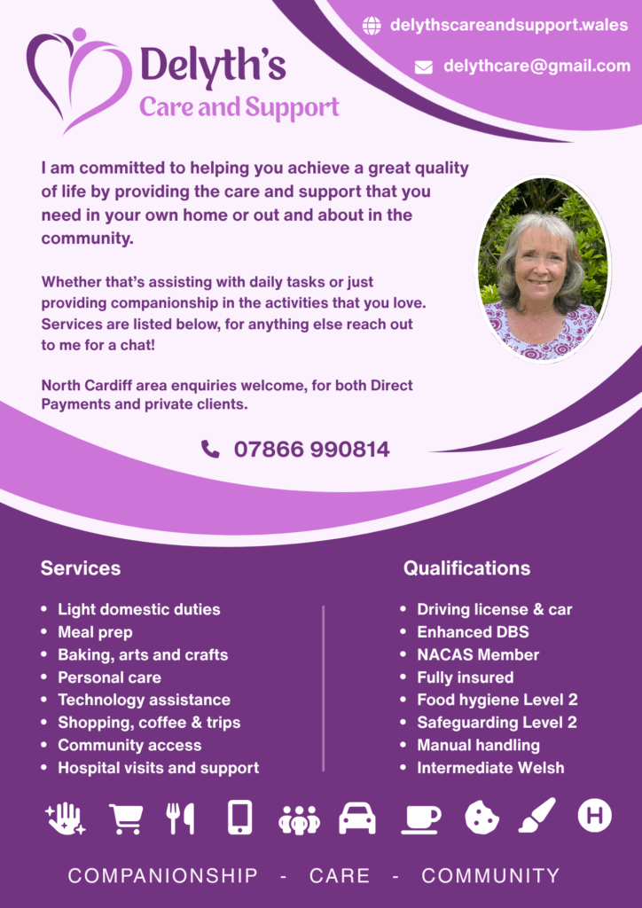 I’m Delyth – I’m here to help you live well, whether that’s in the comfort of your own home or out and about in your community. My support is flexible and tailored to you. I can help with light household tasks, meal preparation, low-level personal care, or even a bit of tech support if you need it. I’m also happy to assist with shopping, attending medical appointments, or simply enjoying a coffee and a chat together.
