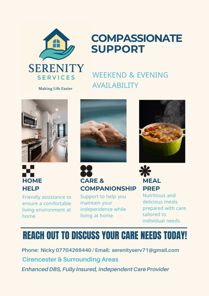 I bring reassurance and a calm, supportive presence to those who need it in and around Cirencester. Whether it’s a helping hand with daily tasks, someone to chat with, or practical support for families. I am friendly, reliable and person-centred and supportive. I offer help around the home, companionship, errands, admin assistance and meal preparation tailored to each individual’s needs. My focus is on comfort, independence and emotional wellbeing, ensuring people feel cared for, connected and confident at home.
