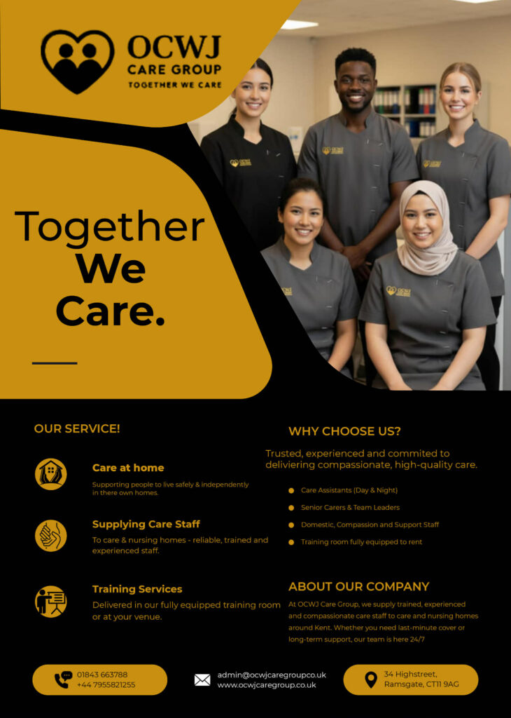 OCWJ Care Group Limited is a locally based health and social care enterprise providing high-quality, person-centred care and staffing services across Kent. We support individuals to remain safe, independent, and dignified in their own homes, while also supplying reliable, fully vetted care staff to residential and nursing homes.