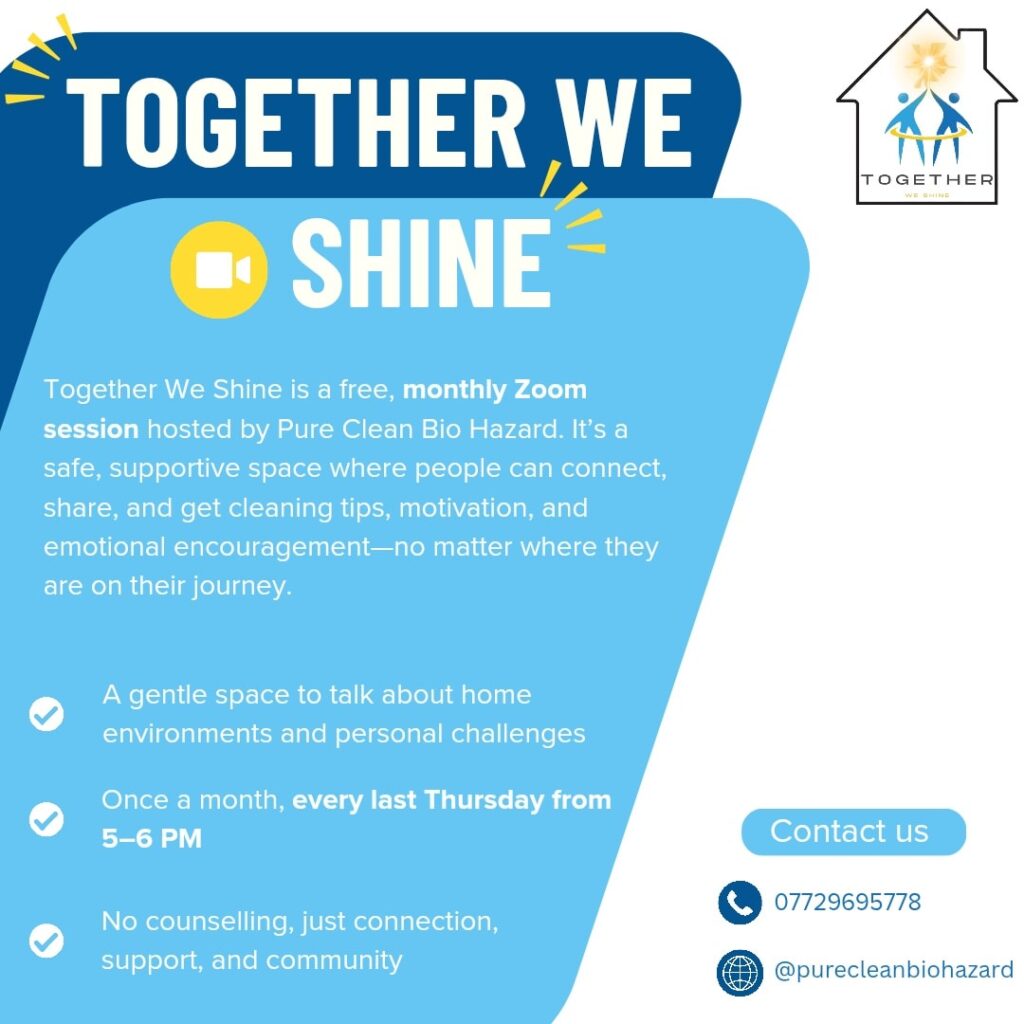 We also believe in the power of community. That’s why we run Together We Shine, a free monthly Zoom session that provides a welcoming space for people to get practical cleaning tips and emotional support. It’s a non-judgmental community where you can connect with others and get encouragement on your journey.
